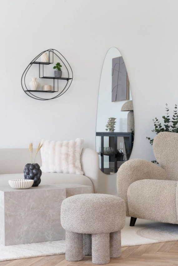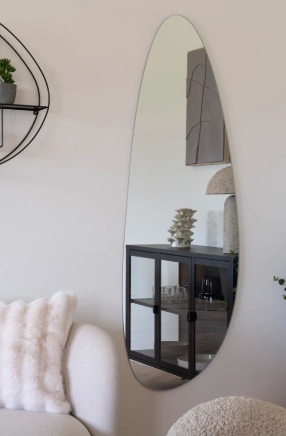 Dette elegante spejl i en organisk form tilfører et moderne og kunstnerisk præg til din indretning. Med sine bløde, naturlige kurver skaber det et unikt og dynamisk udtryk, der passer perfekt til både moderne, minimalistiske og kreative hjem. Med målene 160 x 57 cm har spejlet en imponerende størrelse, der gør det ideelt som gulvspejl eller til vægophæng i entréen, soveværelset eller stuen. Dets flydende form og store spejlflade tilfører lys og dybde til rummet, samtidig med at det fungerer som en dekorativ detalje.