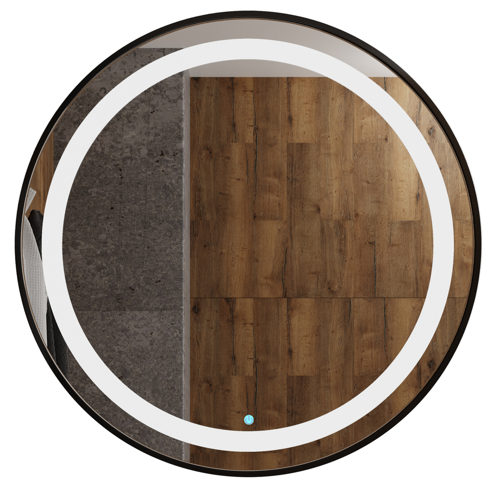 Oplyst LED-spejl med touch-kontakt i sort ramme og sandblæst mønster.