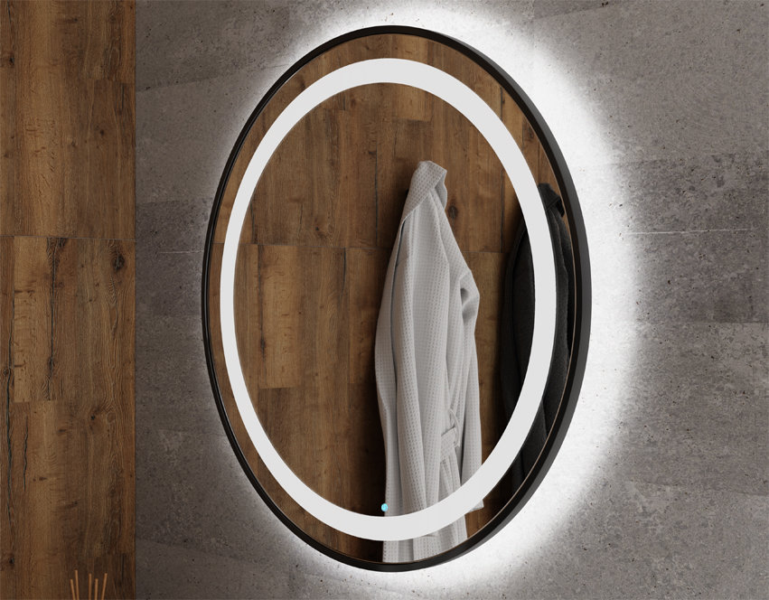 Et sandblæst rundt spejl i en ramme, der er blevet belyst med LED-dioder, er det perfekte produkt til dem, der elsker moderne design.