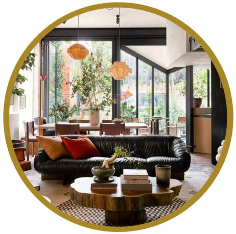 Rundt spejl i en gylden aluminiumsramme