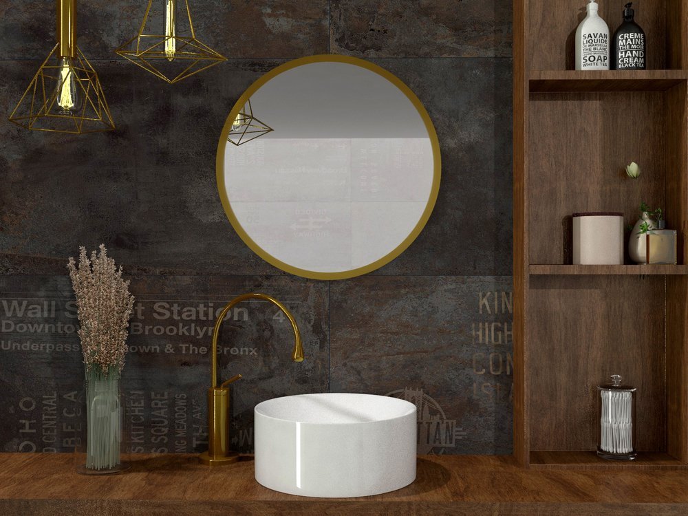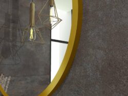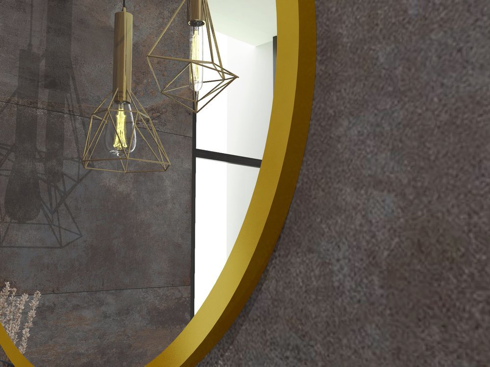 Et rundt spejl i en gylden aluminiumsramme, der er modstandsdygtig over for korrosion, er et ideelt forslag til dem, der sætter pris på komforten ved brug og godt design.