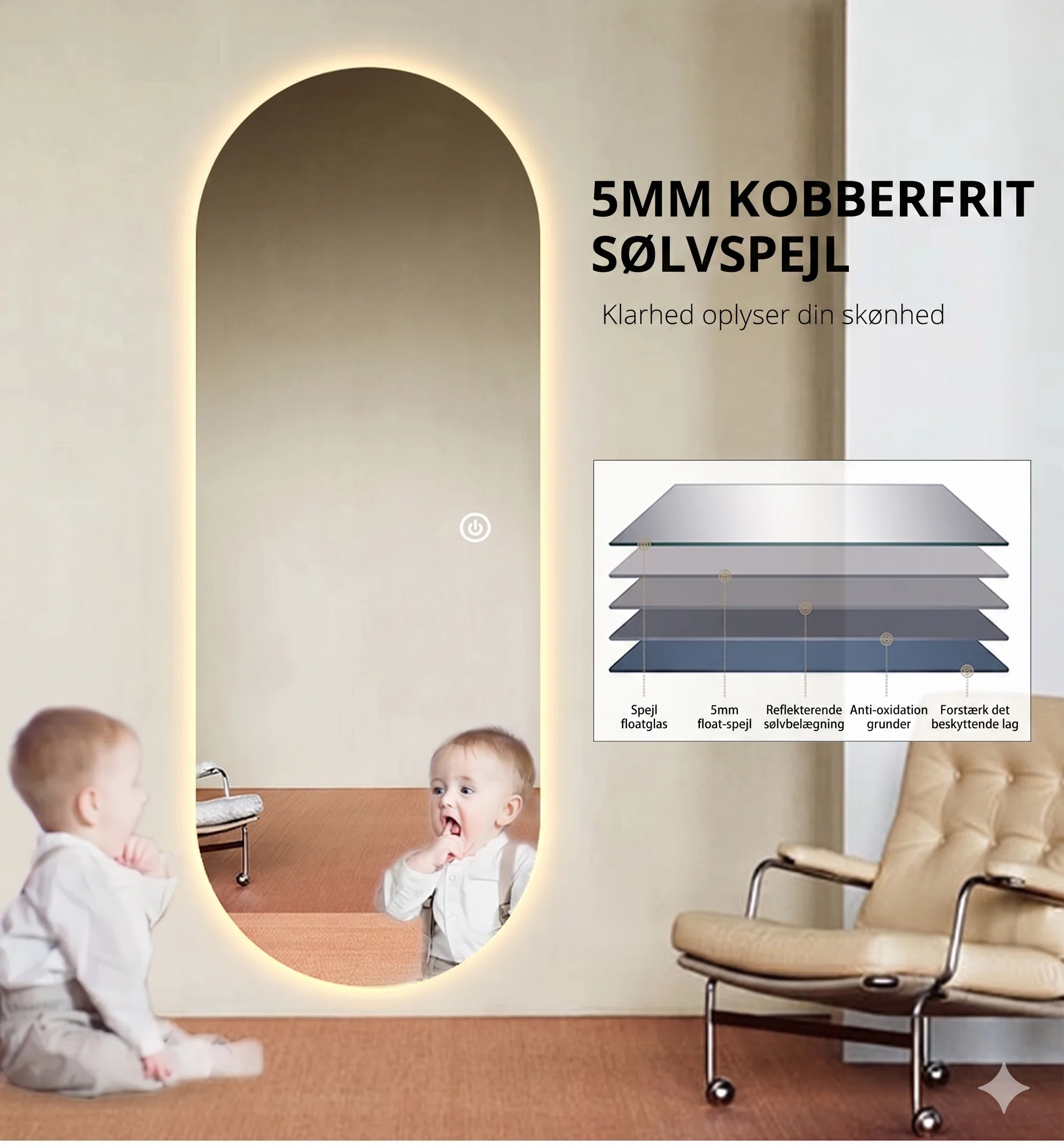 – Leveres i 5mm glastykkelse, som sølv og kobberfrit spejl.