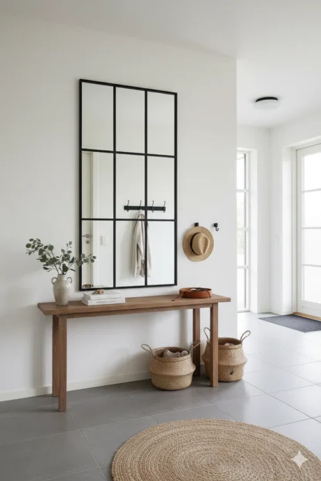 Stort spejl til ophæng på væg med sort jernramme. Spejlet kan både stå på gulvet og hænges op vandret eller lodret.